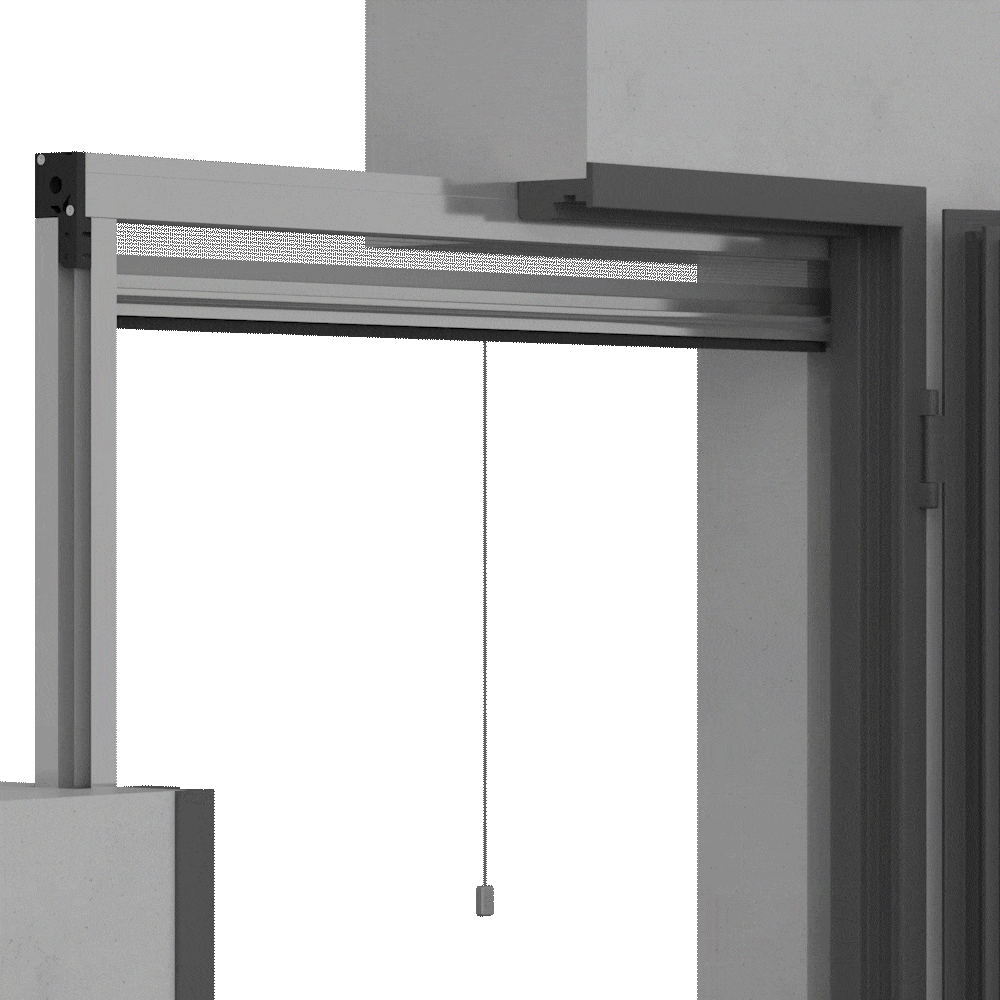 Senkrechtes, aufrollbares, eingebautes Fliegengitter für Fenster. Einbaumontage aus 40 mm Kasten ohne Abstandsstück und Vorderstück.