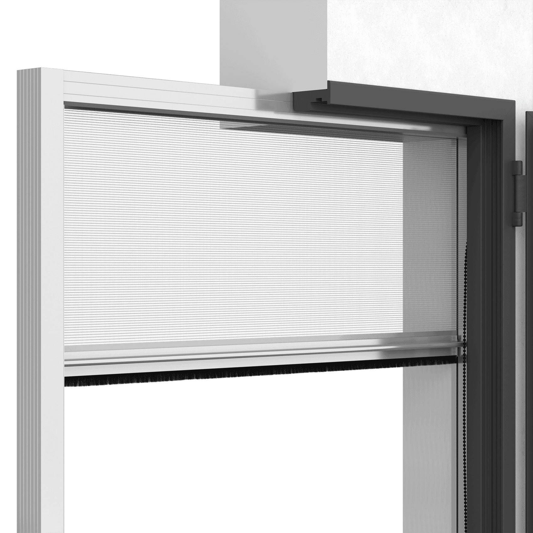 Die quadratische Kassette misst 45 mm. Das Glasfaserngewebe ist an den Rändern elektrogeschweißt, die Einbaugitter-Installation verfügt über eine 50-mm-Schiene. Die Kettenbedienung, standardmäßig innen rechts und mit einfacher Bedienung, ermöglicht die Arretierung des Fliegengitters in der gewünschten Position.