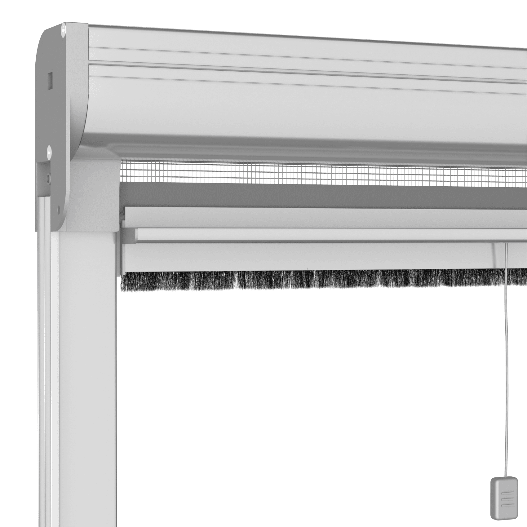 Das Einschalten der Federbremse verlangsamt das Aufrollen des Netzes beim Schließen des Fliegengitters. Wenn die Federbremse eingerastet ist, muss das Mindestmaß der Breite um 200 mm erhöht werden.