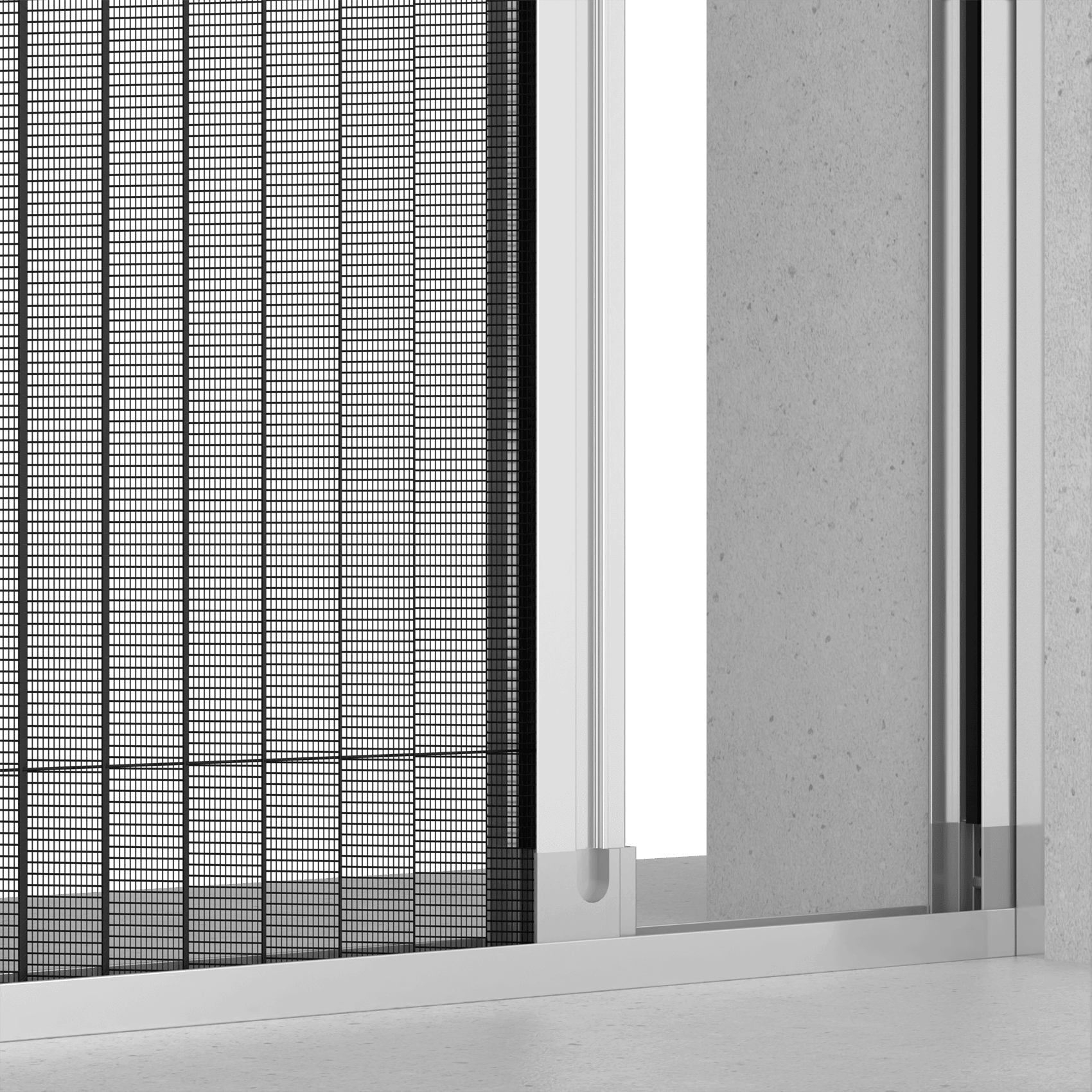 The pleated net of 50 SMART has two colors: black, standard, or gray, on request. The side-sliding movement features a magnetic lock. It is flush-mounted with a 50 mm rail. As standard, the fitted fly screen features a 15 mm bottom guide. You can choose to make it in either single or double shutter version, with central or off-center opening.