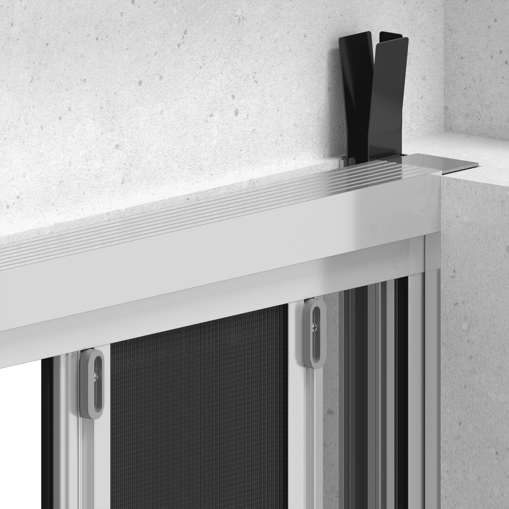 The flush-mounted installation includes a 78 mm spacer that houses both the fly screen and the guide for the shutter. The pleated mesh has two colors: black as standard or gray on request. The bottom guide has a height of 15 mm. Also, depending on your design, you can choose single or double shutter model, with central or asymmetrical handle, and with magnetic closure.