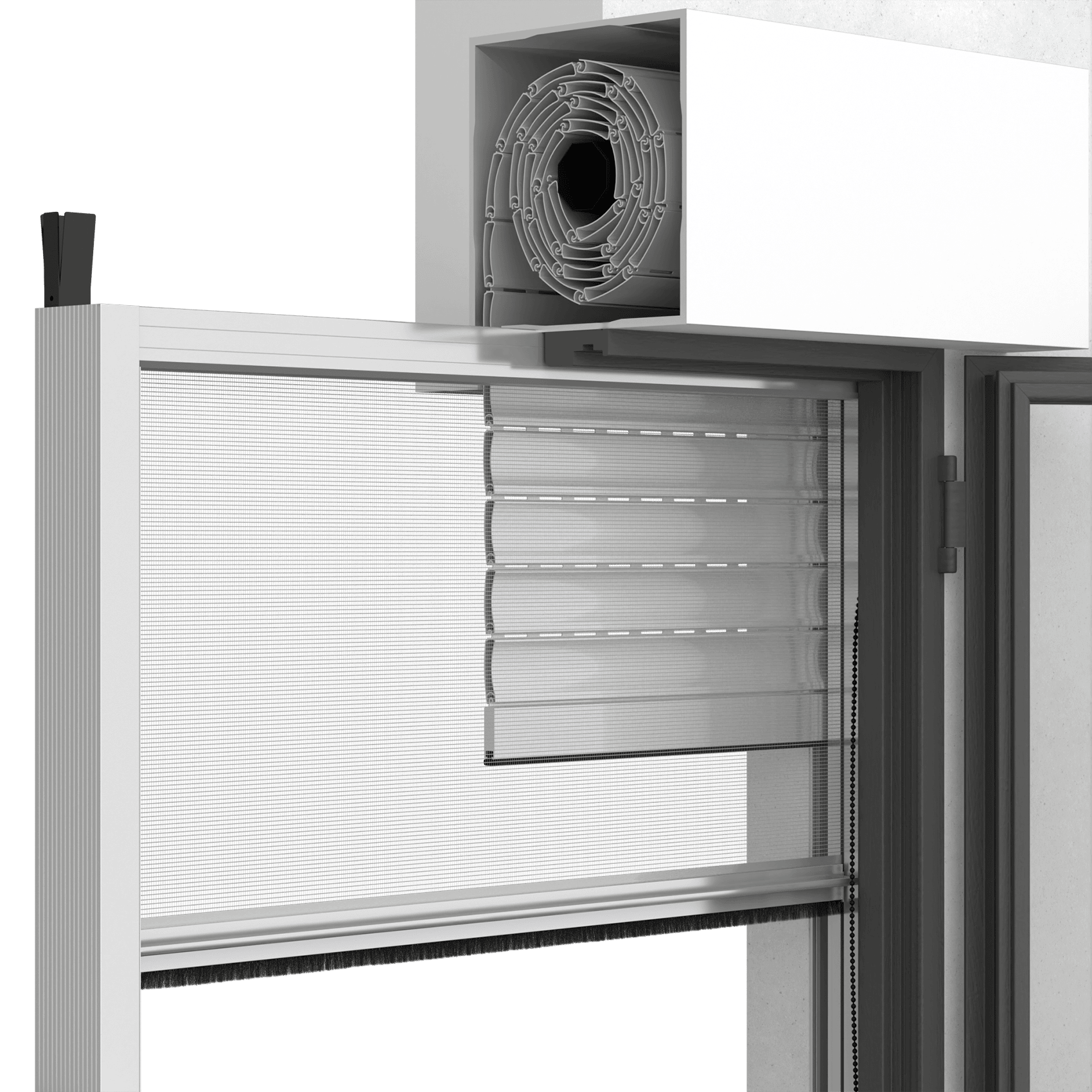 Flush mounting involves a 78mm spacer that accomodates both the fly screen and the guide for the roller shutter. Operation of the fly screen via chain driven with control turns out to be available only in the internal right version, as standard, and internal left, on request. As standard, it presents with gray fiberglass mesh electrowelded at the edges and with buttons.