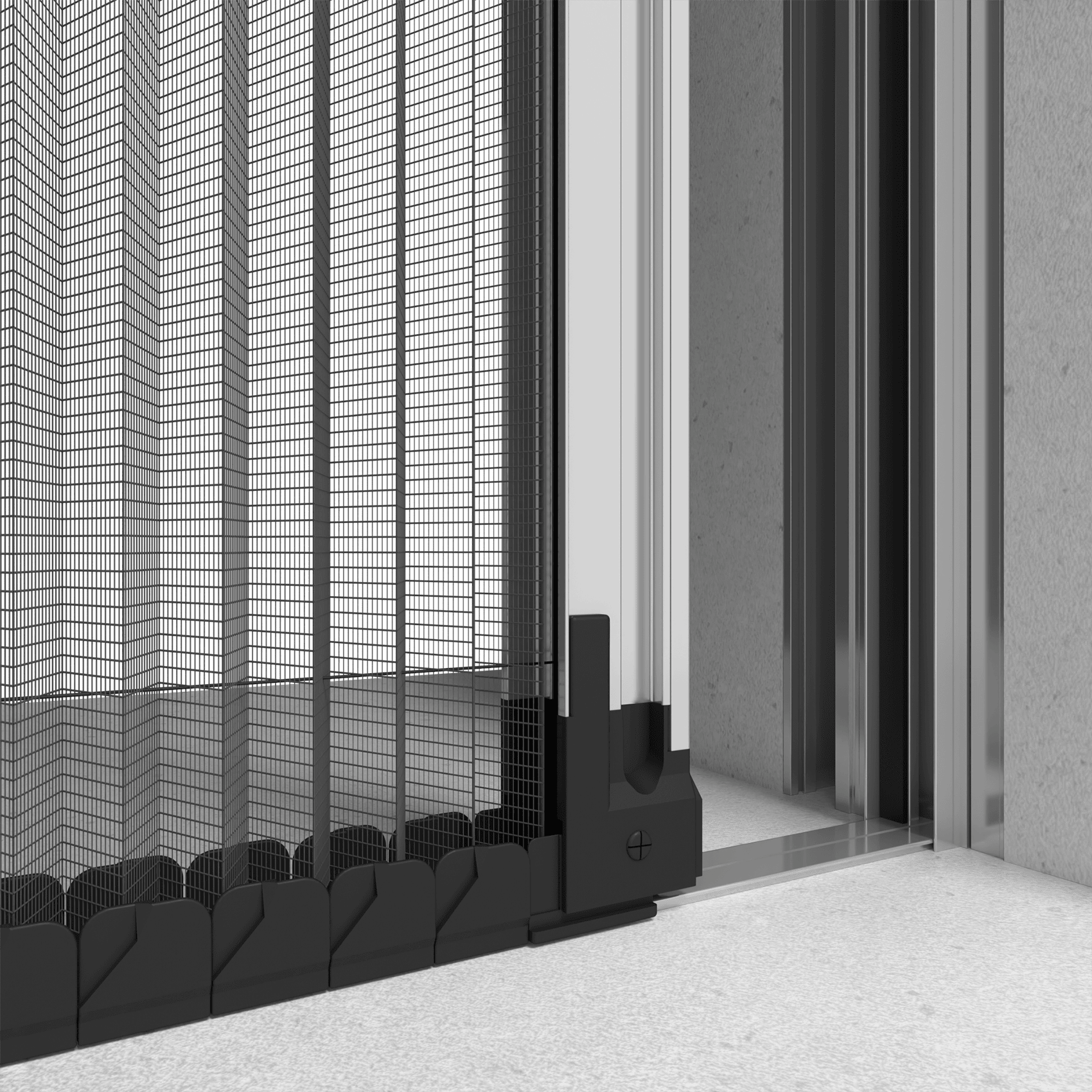 The flush-mounted installation includes a 78 mm spacer that houses both the flyscreen and the guide for the shutter. It comes standard with a black pleated mesh, but you can also request a gray pleated one. The bottom guide has a height of only 3 mm. Also, depending on your design, you can choose single or double shutter model, with central or asymmetrical handle, and magnetic closure.